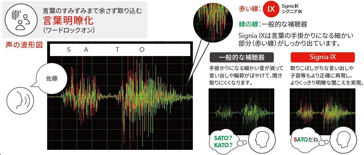 搭載機種は「IXシリーズ」で両耳装用時に働きます。片耳装用の場合は、ワードロックオン機能で言葉のすみずみまで余さず取り込みます。